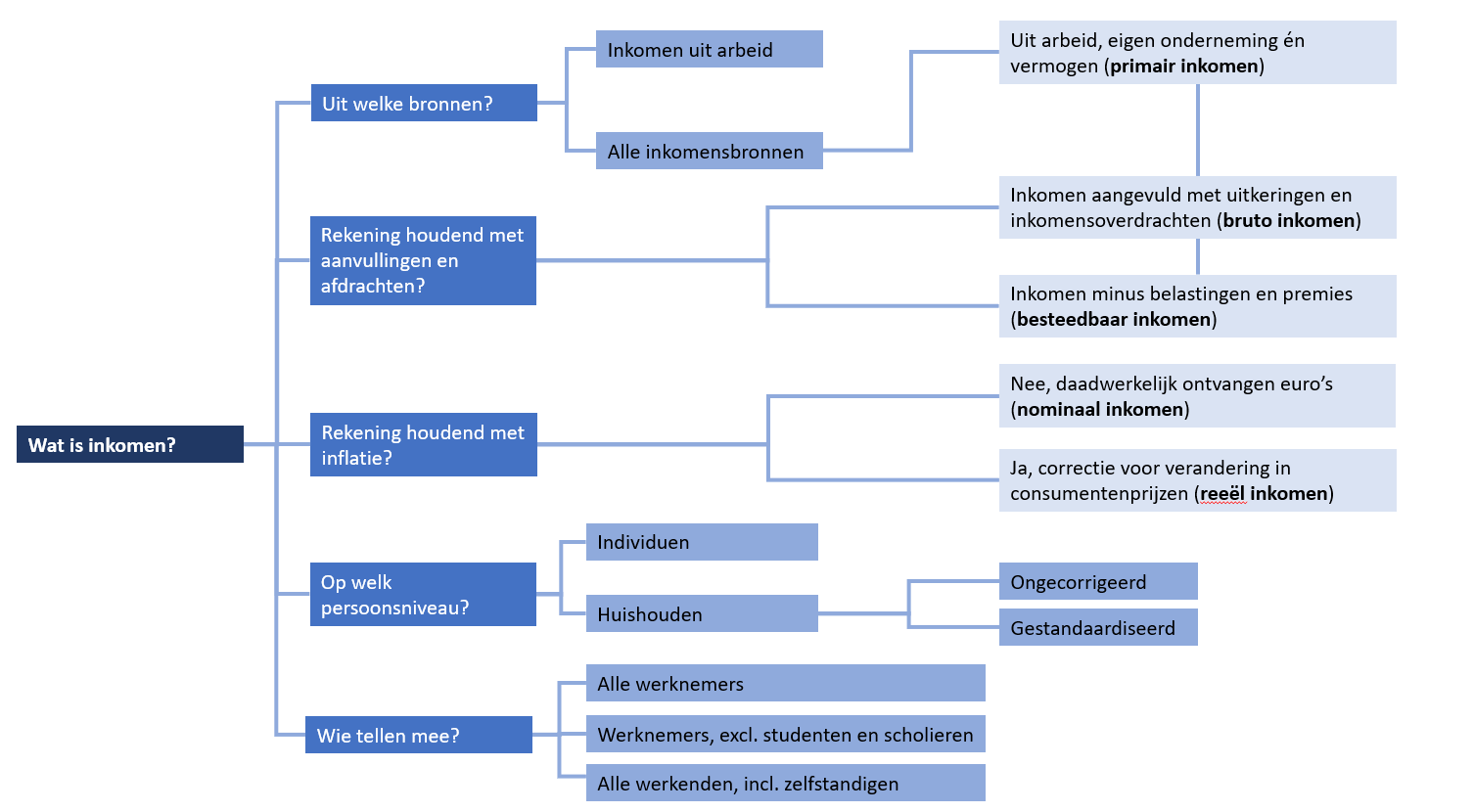 Vijf vragen zijn bepalend: welke inkomensbronnen tellen mee, met welke aanvullingen en afdrachten hou je rekening, in hoeverre is er gecorrigeerd voor inflatie, op welk persoonsniveau wordt het inkomen berekend en wie tellen er mee?
